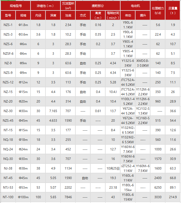 濃縮機主要由圓形濃縮池和耙式刮板機兩部分組成。濃縮池里懸浮于礦漿中的固體顆粒在重力作用下沉降,上部則成為澄清水,使固液得以分離。沉積于濃縮池底部的礦泥由耙式刮板連續地刮集到池底中心排礦口排出,而澄清水則由濃縮池上沿溢出。