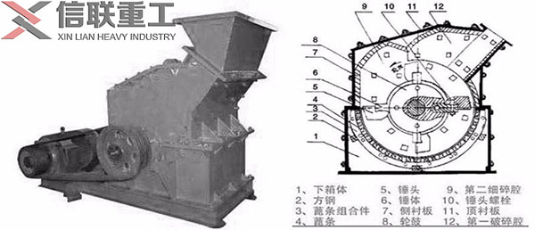 石料由機器上部直接落入高速旋轉的轉盤;在高速離心力的作用下,與另一部分以傘型方式分流在轉盤四周的飛石產生高速碰撞與高密度的粉碎,石料在互相打擊后,又會在轉盤和機殼之間形成渦流運動而造成多次的互相打擊、摩擦、粉碎,從下部直通排出。形成閉路多次循環,由篩分設備控制達到所要求的粒度。